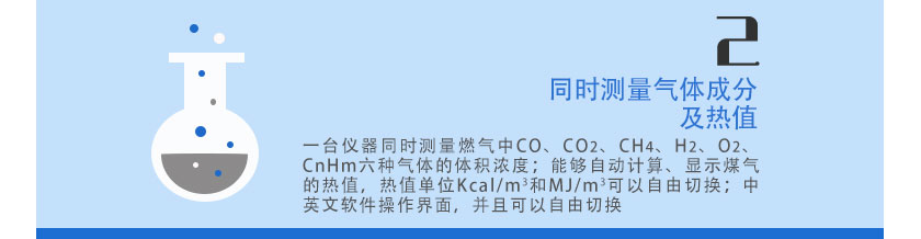 采用進口NDIR非分光紅外傳感器,長壽命電化學傳感器,運用先進的數字處理技術,可同時測量沼氣中CH4、CO2、H2S、O2、CO、H2的體積濃度,根據氣體濃度值快速準確計算出相應的熱值。