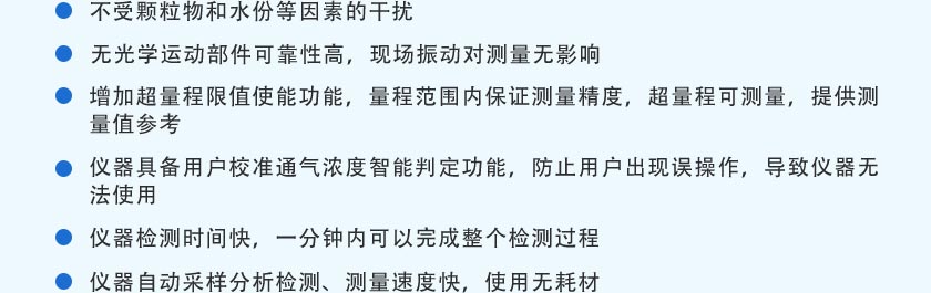 SO2、NOx:紫外DOAS技術(shù);O2:電化學(xué)技術(shù);CO:電化學(xué)技術(shù)/Tdlas激光技術(shù);CO2:NDIR非分光紅外技術(shù) |