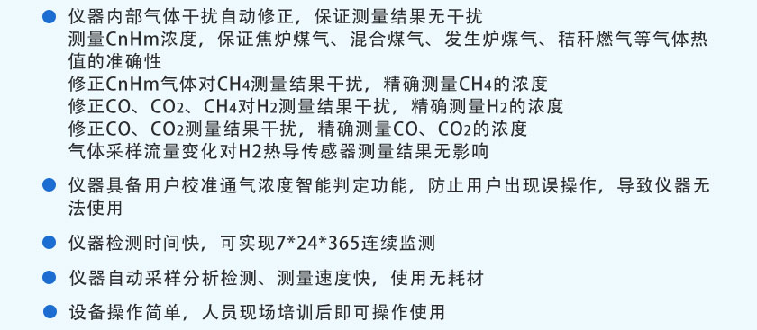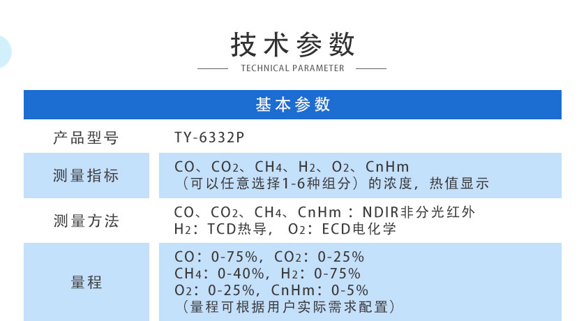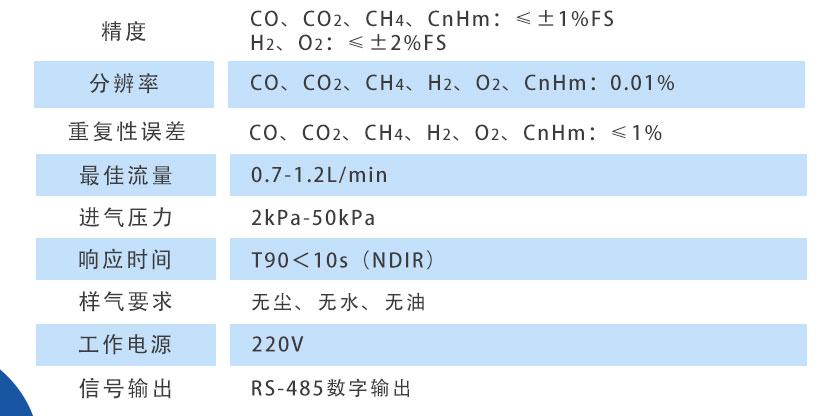 CO、CO2、CH4、CnHm :NDIR非分光紅外;H2:TCD熱導, O2:ECD電化學 |