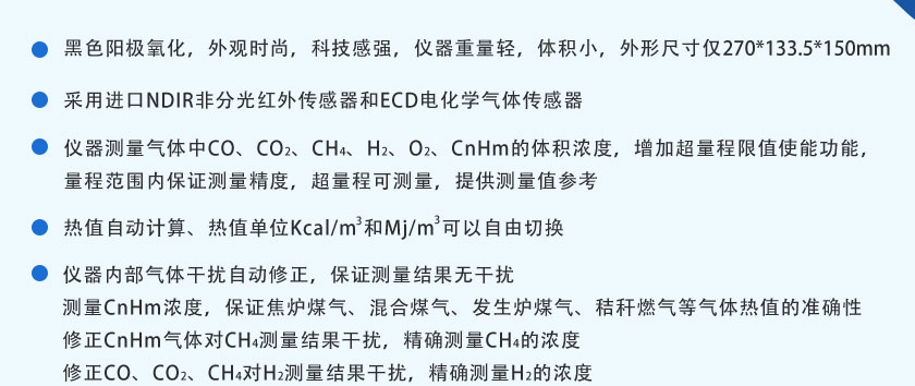 采用自主知識產權的NDIR非分光紅外技術,主要用于測量氣體中的CO、CO2、CH4、C3H8、SO2、NO等氣體的體積濃度及熱值。全進口傳感器、測量精度高、結構簡單、維護方便,軟件功能強大,可拓展性強、現場實用性好,目前暢銷國內外。