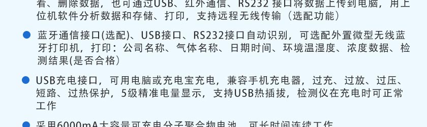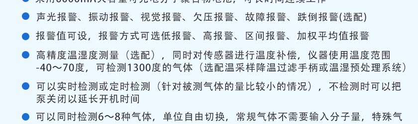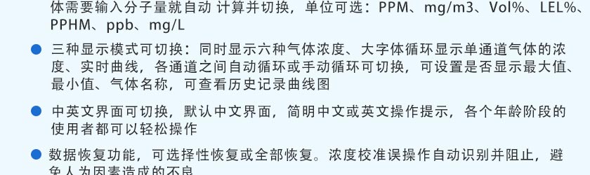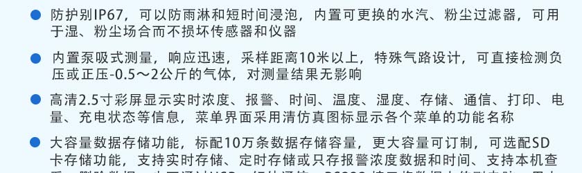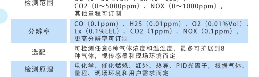 CO(0.1ppm)、H2S(0.01ppm)、O2(0.01%Vol)、Ex(0.1%LEL)、CO2(1ppm)、NOX(0.1ppm),更高分辨率可訂制