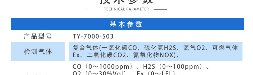 CO(0~1000ppm)、H2S(0~100ppm)、O2(0~30%Vol)、Ex(0~100%LEL)、CO2(0~5000ppm)、NOX(0~1000ppm),其他量程可訂制
