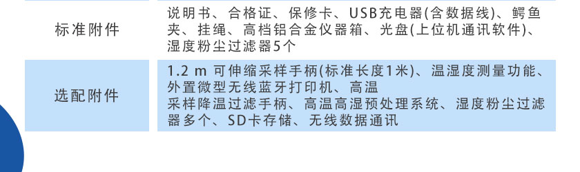 1.2m可伸縮采樣手柄(標準長度1米)、溫濕度測量功能、外置微型無線藍牙打印機、高溫采樣降溫過濾手柄、高溫高濕預處理系統、濕度粉塵過濾器多個、SD卡存儲、無線數據通訊