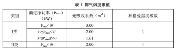 (2)煙度限值:非道路柴油移動(dòng)機(jī)械排氣的不透光法煙度(光吸收系數(shù))和林格曼黑度系數(shù)不應(yīng)超過表1規(guī)定得限值。