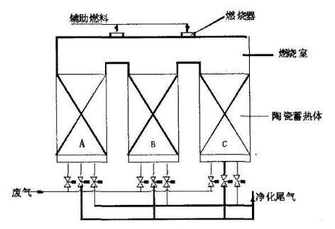 RTO裝置主要是由多臺蓄熱室和頂部相連通燃燒室組成,其中蓄熱室內部通常采用具有良好耐高溫性能的陶瓷材料作為蓄熱體。燃燒室舍友輔助燃燒器,可用油或天然氣作為燃料。輔助燃燒器的作用主要是為了在開車時將蓄熱體加熱到一定溫度,或當廢氣中可燃物的濃度較低時,需要補充燃料來維持燃燒室所要求達到的反應溫度。