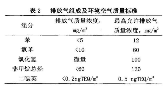 按表1中各污染物排放最為嚴格的標準制定了該企業的治理目標,即ρ(非甲烷總烴)不大于20mg/m3;ρ(苯)不大于4mg/m3;ρ(氯苯類)不大于50mg/m3;ρ(氯化氫)不大于30mg/m3;ρ(二噁英)不大于0.1ng/m3。