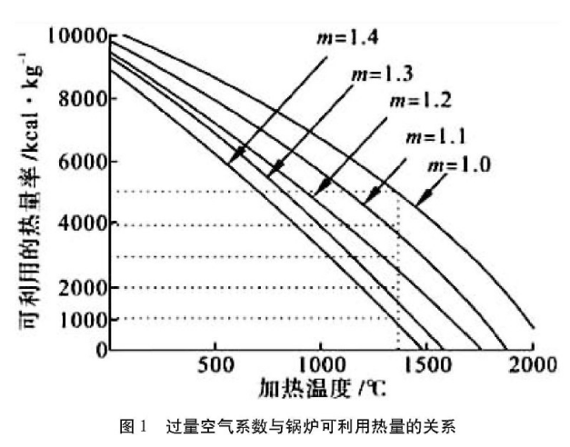燃氣鍋爐運行中,過量空氣系數的選取非常重要,過量空氣少了會導致燃燒不完全,增加Q3熱損失;過量空氣多了會降低煙氣的輻射能力,受熱面的利用率降低,更為重要的是過量空氣的多少會直接影響鍋爐熱效率。本改造項目中,由于燃料主要是燃點較高的高爐煤氣,為保證燃燒完全,采用了較高的過量空氣系數。但當采用富氧燃燒時,由于火焰溫度提高,燃料燃點在富氧條件下也有所降低,因此可以采用較低的過量空氣系數(見表1)。研究表明,過量空氣系數越低,鍋爐可利用熱量越高(見圖1)。所以在采用富氧燃燒的鍋爐中,取較低的過量空氣系數,既可以保證燃燒完全,又可以減少排煙熱損失,鍋爐效率明顯提高。