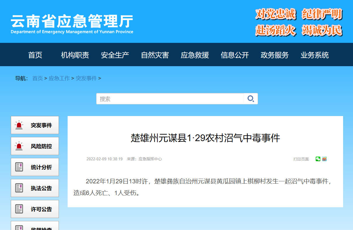 2月9日,云南省應急管理廳通報了“楚雄州元謀縣1·29農村沼氣中毒事件”。