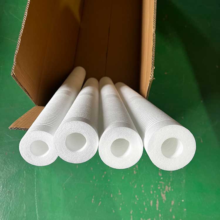 (2)過濾阻力小,濾流量大、納污量大、使用壽命長,本品在生產過程中纖維直徑及間隙可調,濾芯微孔內層小外層大,增大了流量和納污量,濾芯不易阻塞,延長使用壽命。