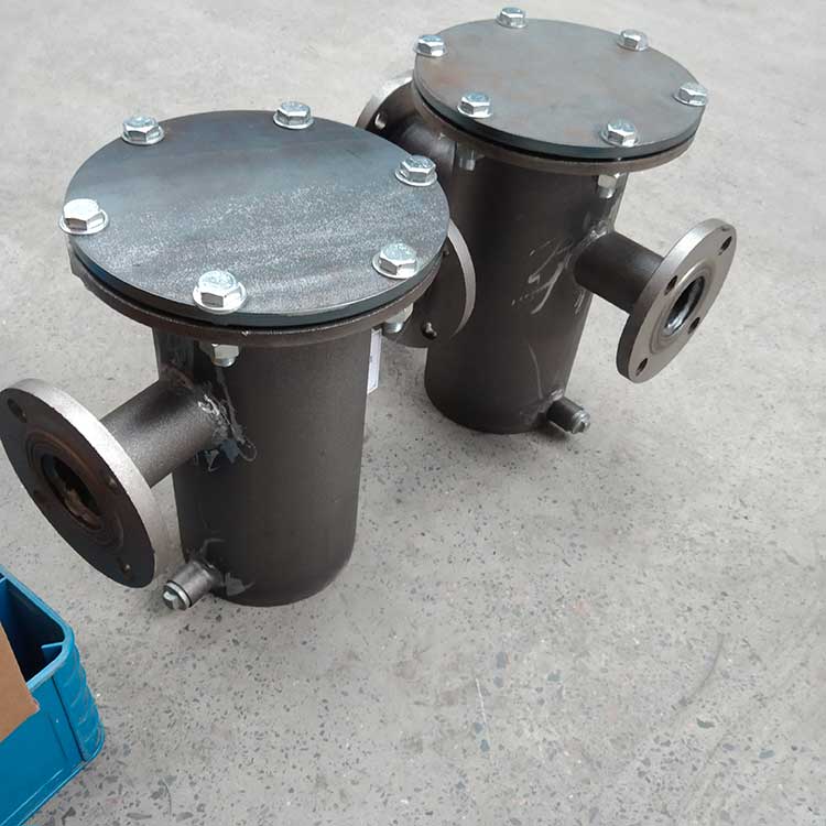 籃式過濾器主要由接管、筒體、濾籃、法蘭、法蘭蓋及緊固件等組成。當流體進入有一定規格的濾網的濾桶后,其雜質被阻擋,而清潔的濾液則由過濾器出口排出,當需要清洗時,只要將可拆卸的濾桶取出,處理后重新裝入即可,因此,使用維護極為方便。籃式過濾器具有結構簡潔,阻力小,排污方便等特點。適用介質可為水、油、氣。一般通水網為18~30目,通氣網為40~100目,通油網為100~480目,可按用戶要求制作濾網,介質溫度:≤200℃。